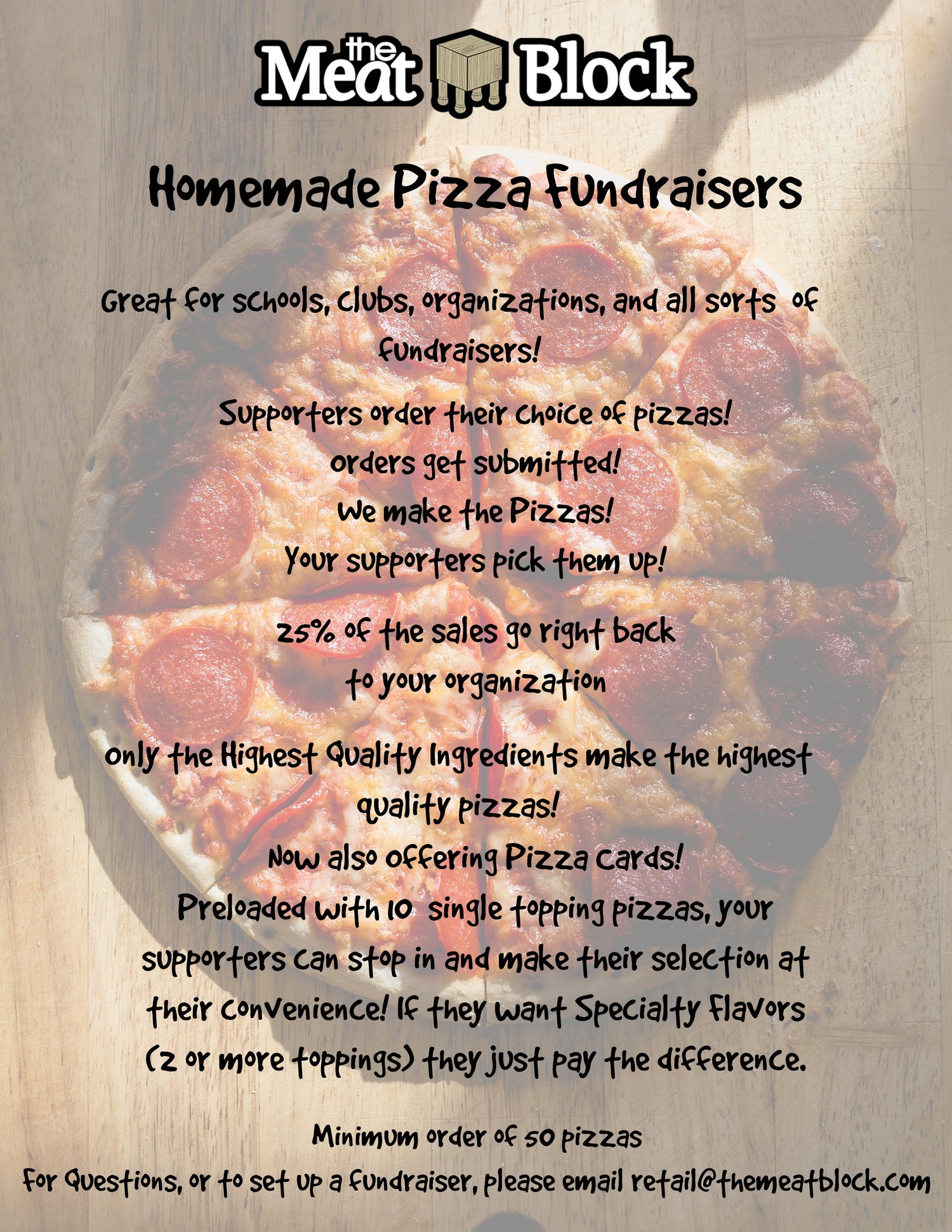 Everyone loves Pizza! Give them as Gifts, Stock your freezer, have a pizza party; pizzas are a great idea for any fundraiser.