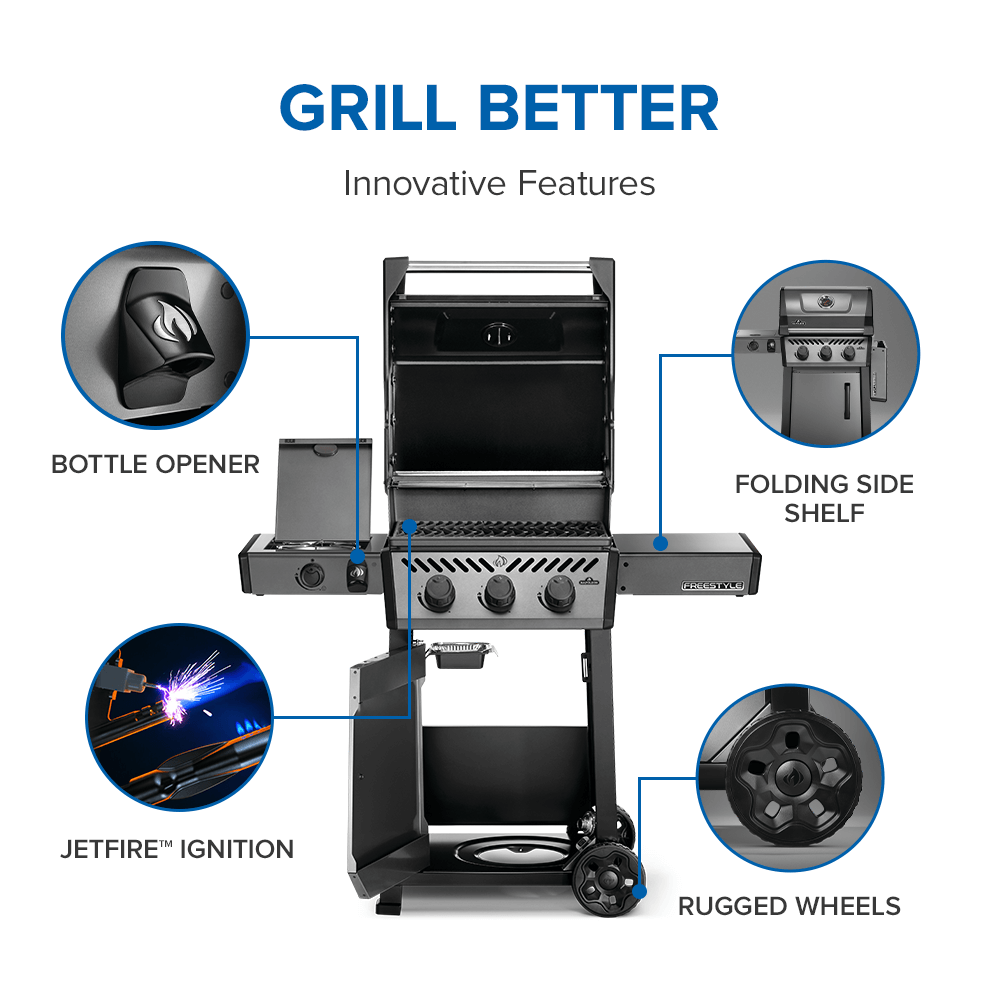 The Freestyle™ Gas Barbecue is a compact grill with premium features and unbeatable value. Ignited by the instant JETFIRE ignition system that lights the main burners with a jet of flame easily, every time. Get the perfect sear over the cast iron porcelainized enamel cooking grids. Four stainless steel burners provide even heat, easily controlled and monitored by the onboard temperature gauge. The rugged wheels allow this barbecue to go where the action is, while the easy-to-fold right side shelve, featuring tool hangers and a bottle opener, make sure that the Freestyle™ meets your lifestyle and space.